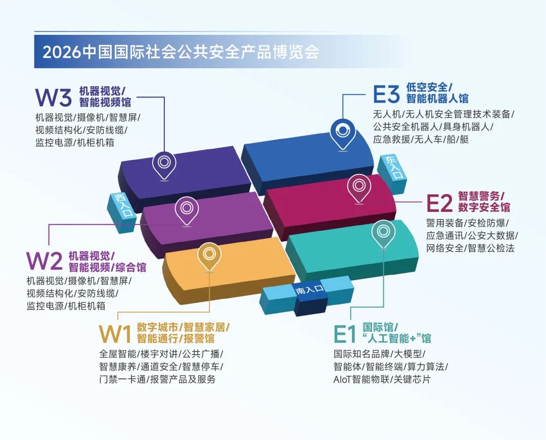 2026安博会规划了“1个核心馆+5个专业馆”的展区格局,即E1国际馆/“人工智能+”专馆、E2智慧警务/数字安全馆、E3低空安全/智能机器人馆、W1数字城市/智慧家居/智能通行/报警馆、W2和W3机器视觉/智能视频综合馆,锚定人工智能、智能物联、数字城市、出入口智能管理、周界报警、智慧警务、数字安全、无人机&低空安全、智能机器人、应急救援等领域,精准链接产业链上下游资源,全方位擘画安防产业交流新图景。